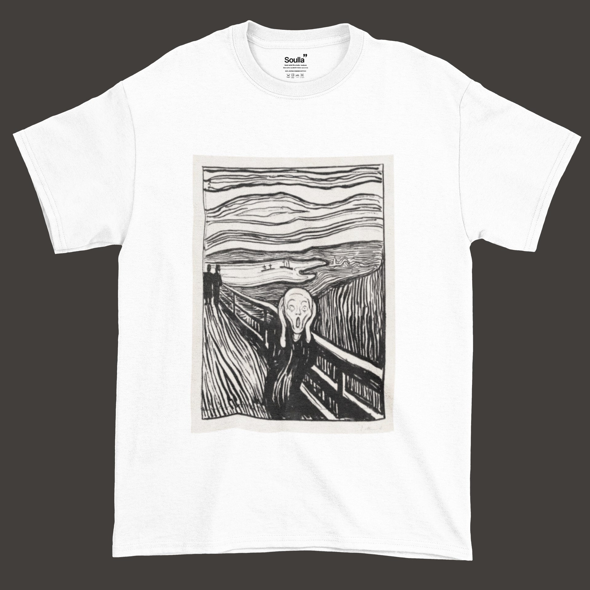 Introducing Soulla's latest addition to your wardrobe - the black and white monochrome oversized t-shirt featuring Edvard Munch's masterpiece "The Scream" or "The Cry". Made with 100% premium cotton, this t-shirt is a statement piece that combines comfort and style, so you can express your love for art while feeling comfortable and confident.